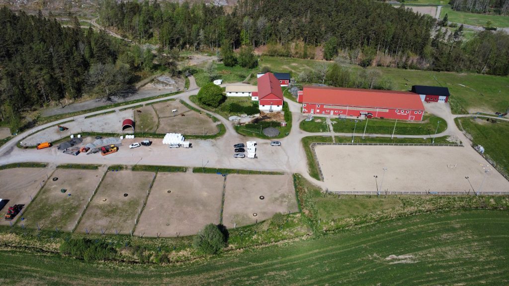 Vi har ett ridhus på 60 x 20 meter, med en cafeteria och läktare.